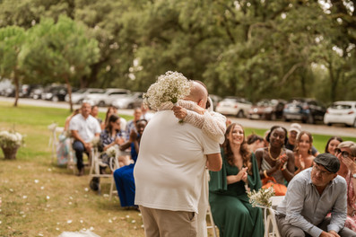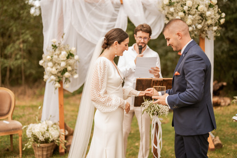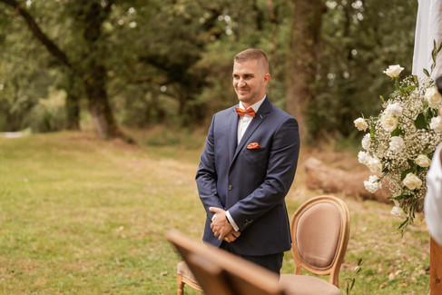Avec quelques heures encore avant la cérémonie laïque, Noémie a enfilé sa robe, entourée de ses témoins et demoiselles d’honneur. Pendant ce temps, les invités commençaient à arriver, et l'excitation était palpable. Je vous laisse imaginer l'ambiance magique qui régnait. La cérémonie fut douce, émouvante, et je n'ai pas pu m'empêcher de verser ma petite larme en capturant ces instants si précieux.